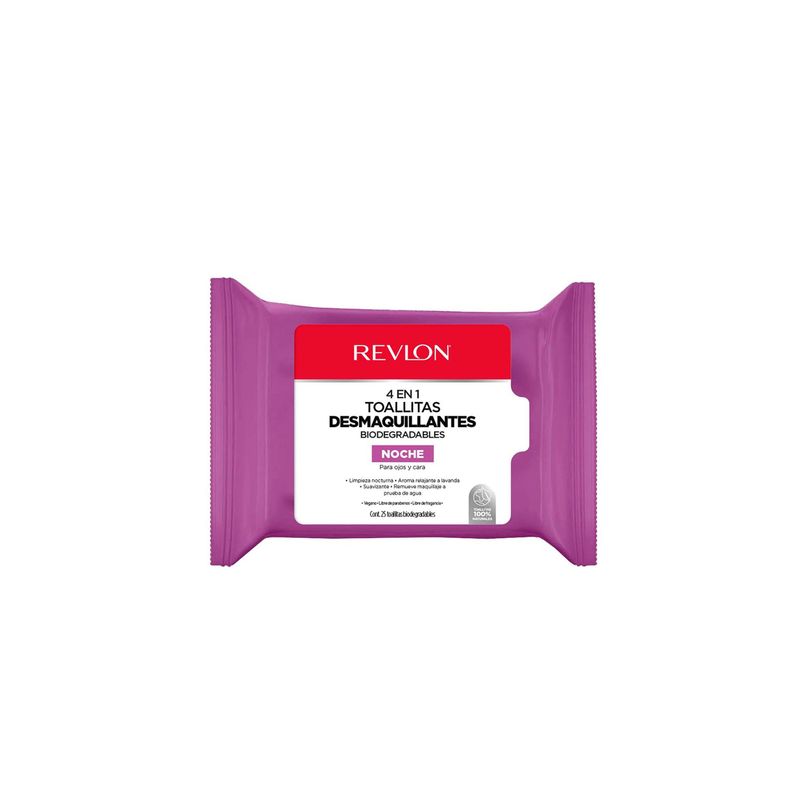 Toallitas Desmaquillantes 4 en 1 Noche Revlon, para ojos y cara, remueve maquillaje a prueba de agua y suaviza. Su fórmula especial 4 en 1 hidrata y calma la piel, a la vez que proporciona una eliminación completa y eficaz del maquillaje resistente al agua y la suciedad.