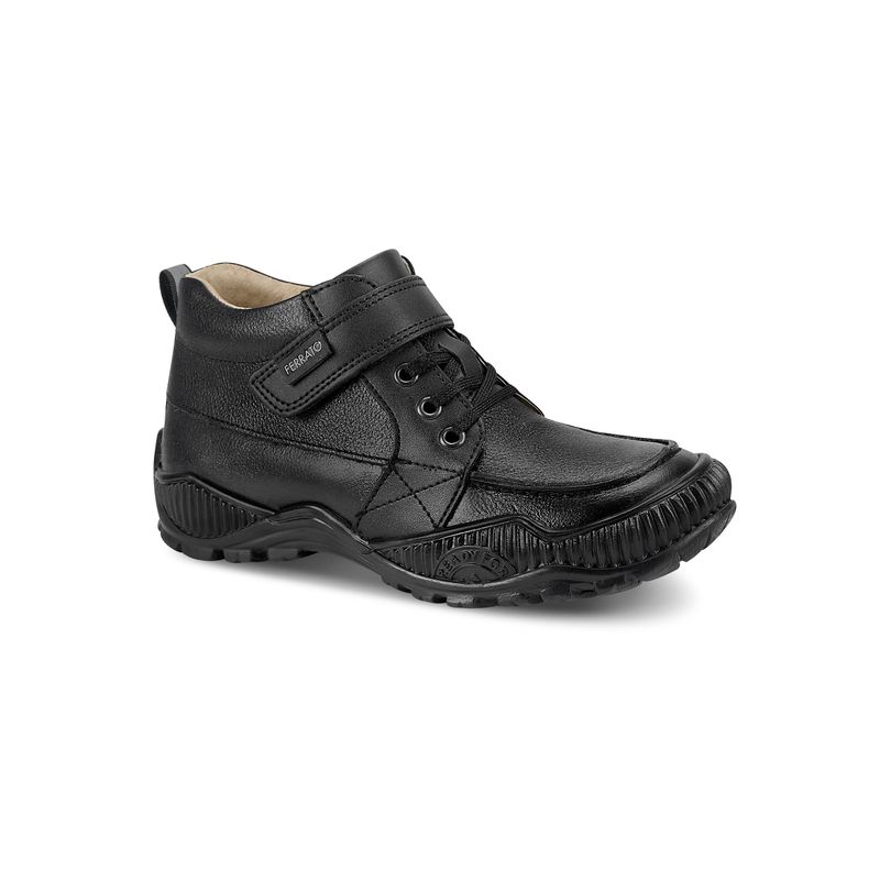 Este botín escolar negro para niños está hecho de piel y tiene una suela antiderrapante.