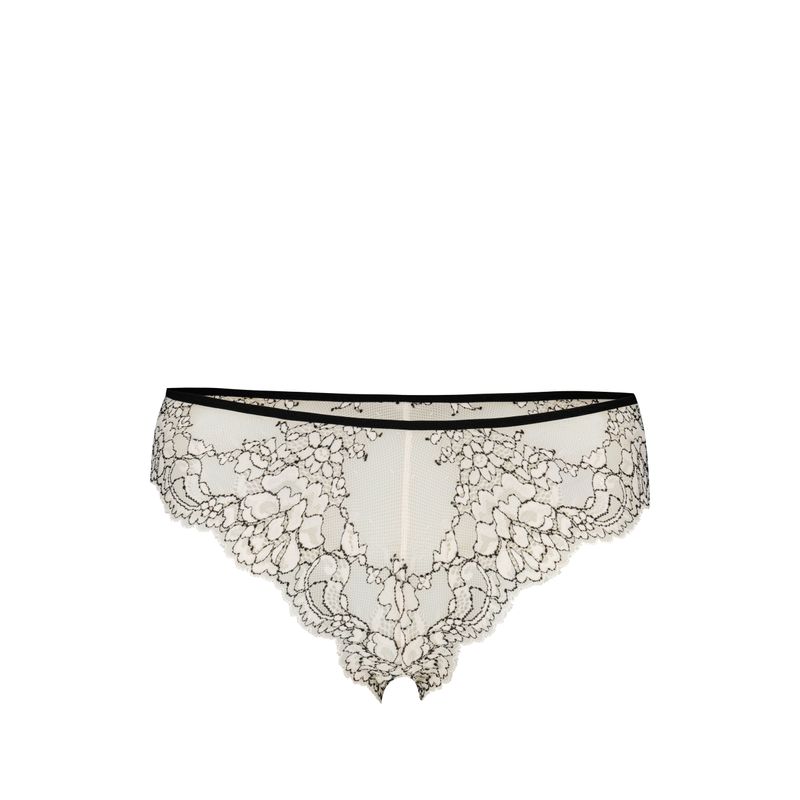 Panty para mujer confeccionado en color blanco con detalles en negro, elaborado con encaje suave y cuidadosamente seleccionado para brindar una sensación delicada al contacto con la piel. Su diseño equilibra elegancia y sensualidad, complementando de forma armónica otras piezas lenceras con el mismo contraste de color y acabado refinado.
