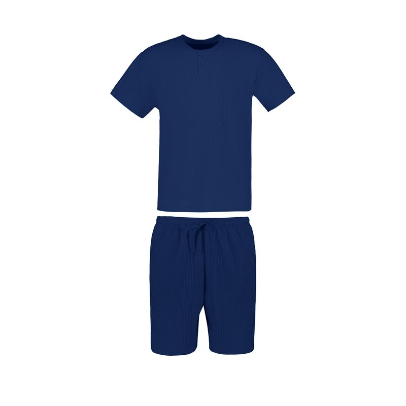 Pijama de caballero de dos piezas, compuesta por playera de manga corta y short, diseñada para ofrecer comodidad y frescura durante el descanso. Su diseño práctico y relajado permite un ajuste cómodo, ideal para quienes buscan una opción funcional para dormir o estar en casa.